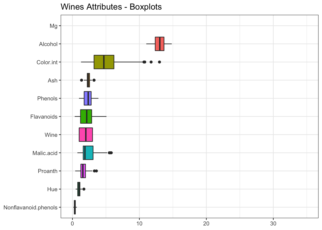 We haven’t included magnesium and proline, since their values are very high and worsen the visualization.