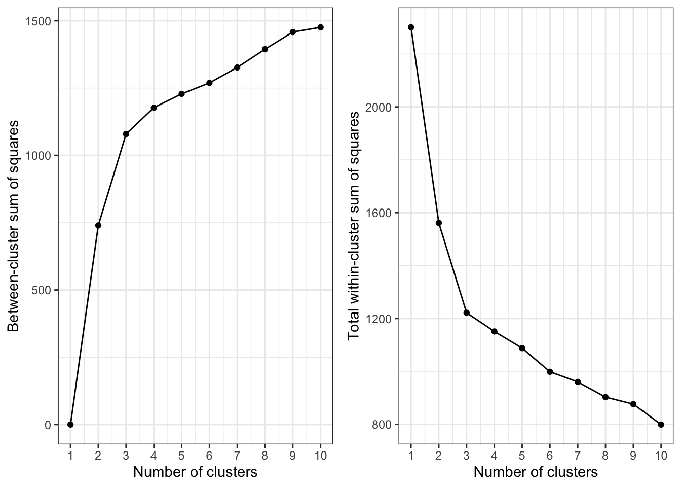 xlab="Number of clusters", ylab="Between-cluster sum of squares") +