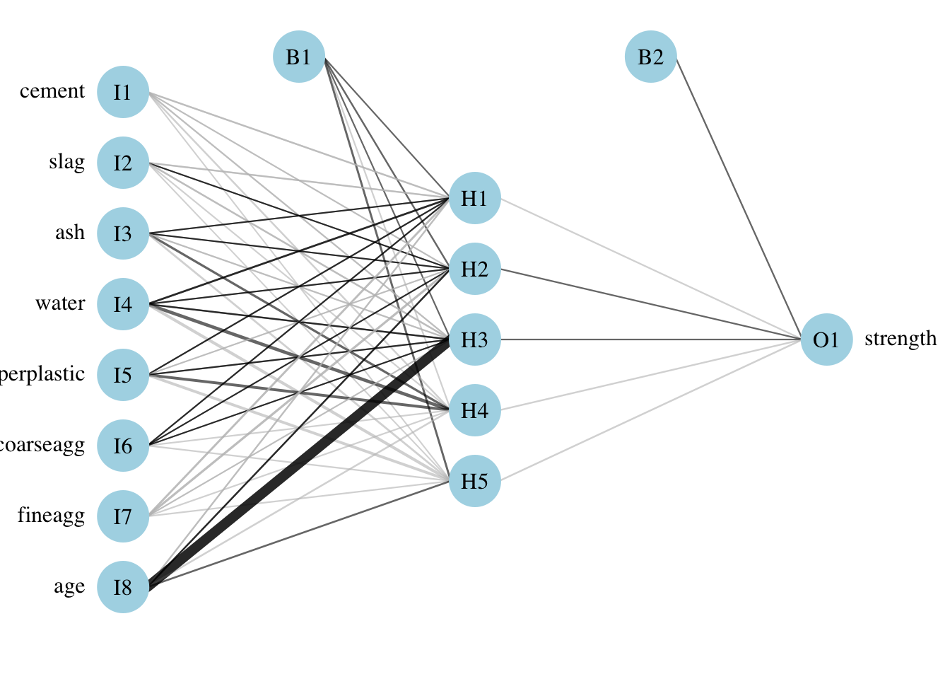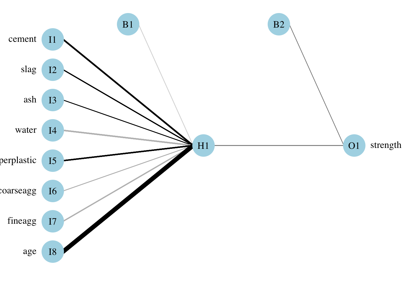 concrete_model2 <- neuralnet(strength ~ cement + slag +