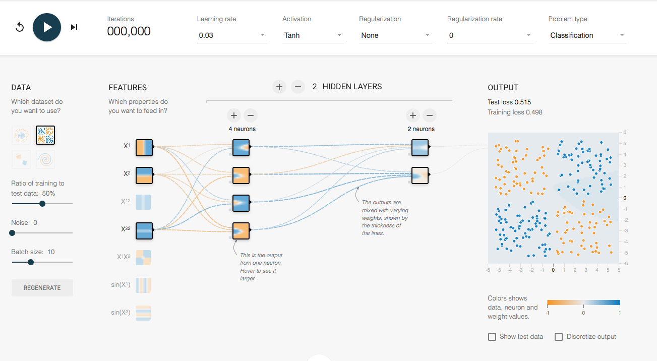 http://playground.tensorflow.org is a website where you can tweak and visualize neural networks.