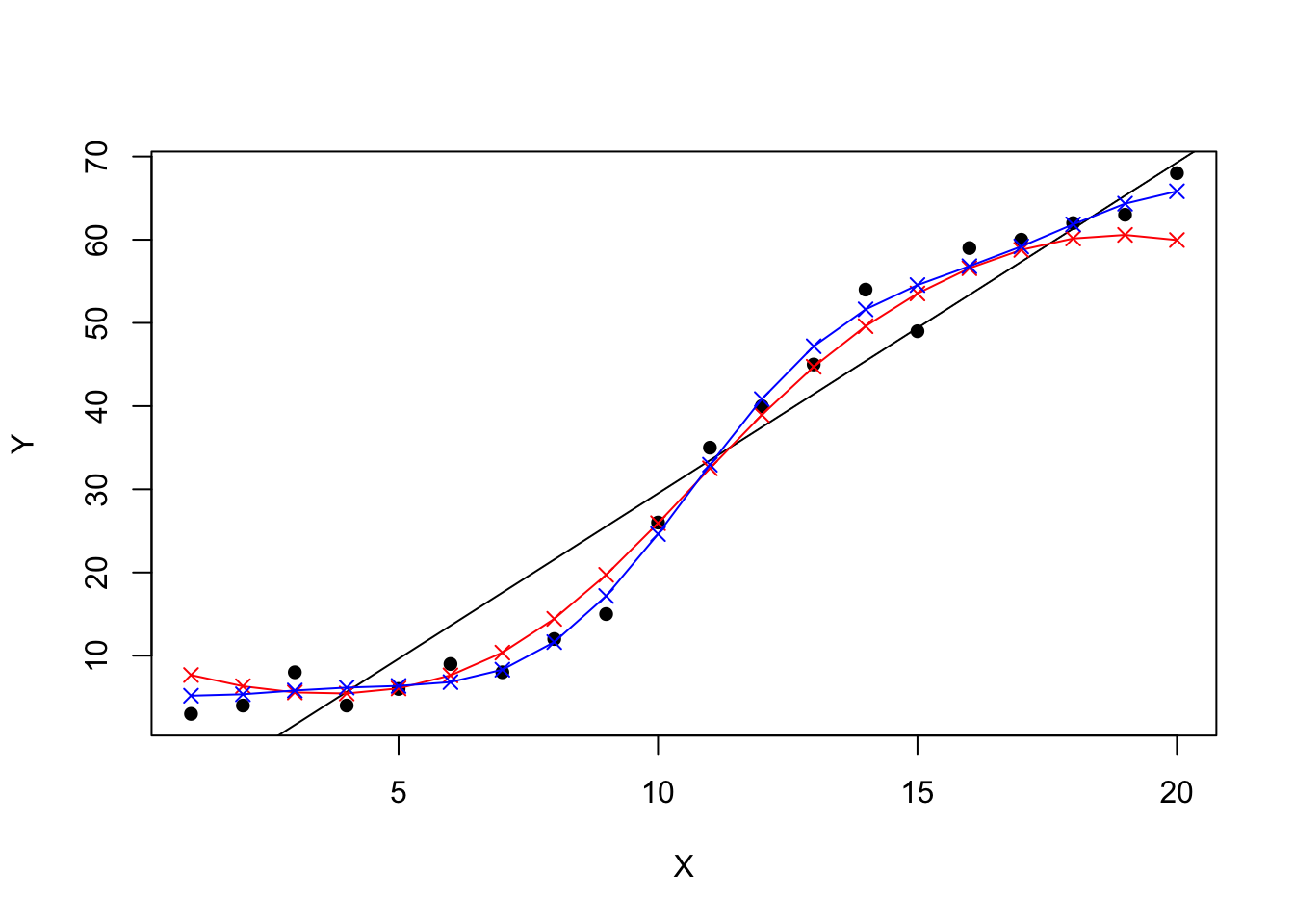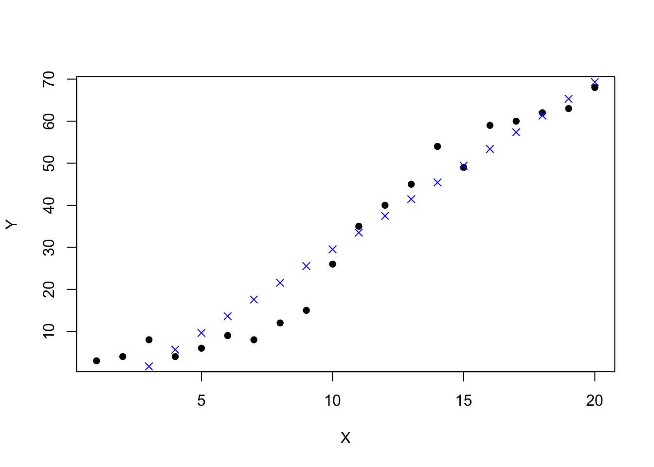points(data$X, predictedY, col = "blue", pch=4)