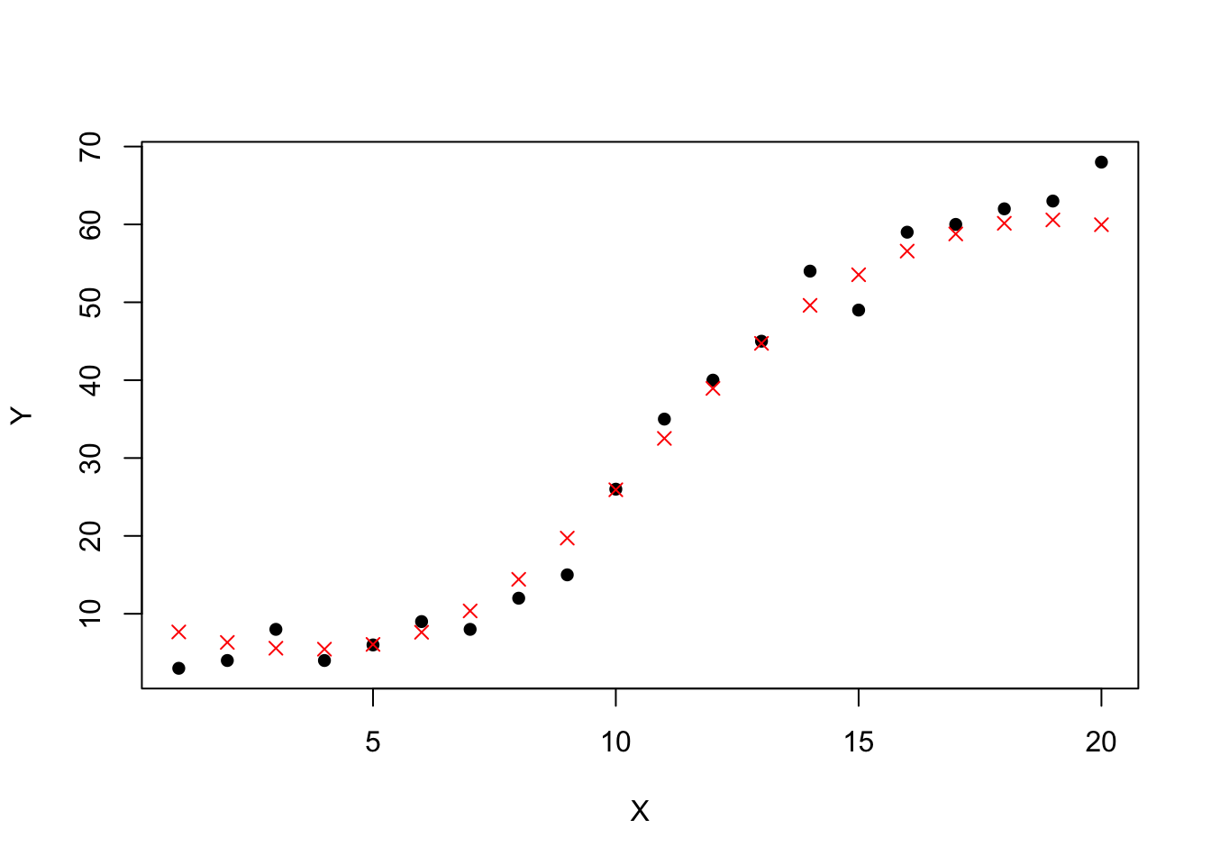 points(data$X, predictedY, col = "red", pch=4)
